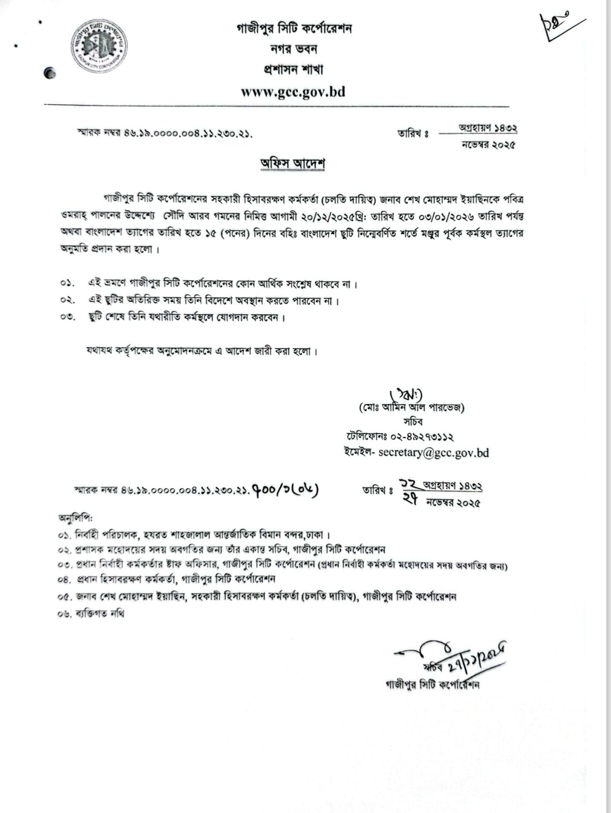 | ৩ | বহিঃ বাংলাদেশ ছুটি নিন্মেবর্ণিত শর্তে মঞ্জুর পূর্বক জনাব শেখ মোহাম্মদ ইয়াছিনকে কর্মস্থল ত্যাগের অনুমতি প্রদান প্রসঙ্গে। | ৪৬.১৯.০০০০.০০৪.১১.২৩০.২১.৭০০/১(০৬) | ১৮-১২-২০২৫ | দেখুন | |
