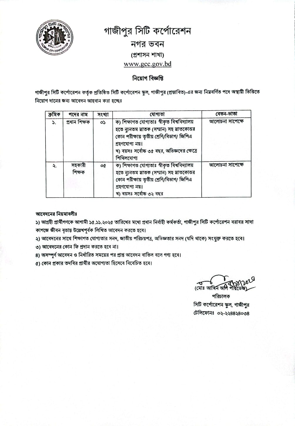 | ৮ | গাজীপুর সিটি কর্পোরেশন স্কুলে শিক্ষক নিয়োগ বিজ্ঞপ্তি প্রসঙ্গে। | | | ০৫-১১-২০২৫ | দেখুন |