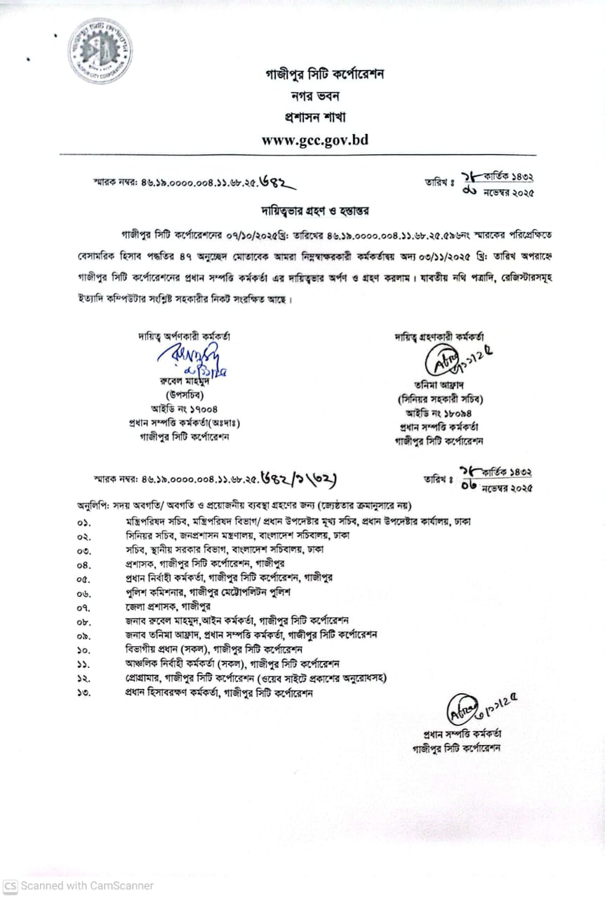 | ৯ | প্রধান সম্পত্তি কর্মকর্তা, গাজীপুর সিটি কর্পোরেশন পদে যোগদান প্রসঙ্গে। | | | ২২-১০-২০২৫ | দেখুন |